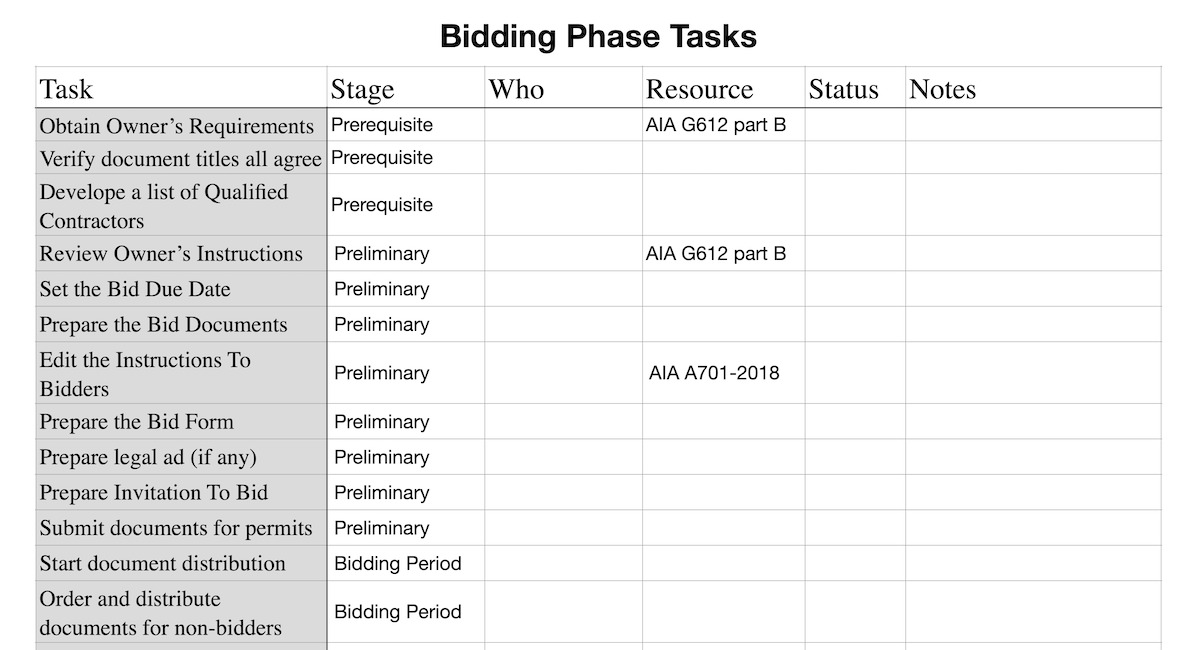 This is a summary of all the Bidding Phase Tasks in spreadsheet format for your use in developing your own project management tool, including a downloadable file.